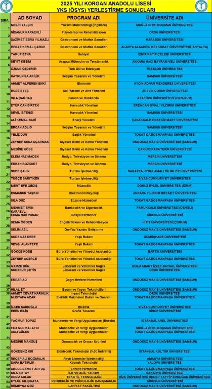 KORGAN ANADOLU LİSESİ 2025 YKS YERLEŞTİME SONUÇLARI: Okulumuzdan mezun olup üniversiteye yerleşen 54 öğrencimizi tebrik ediyoruz.